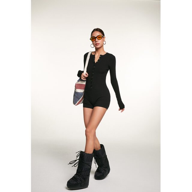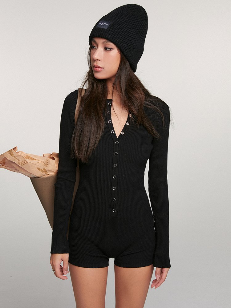 Turn heads with this American-inspired sexy knit jumpsuit, designed for women who love bold and confident street style. Crafted from soft, stretch-knit fabric, this romper features a flattering slim-fit silhouette with a front button-up design, making it both stylish and functional. The long sleeves balance its daring appeal, while the short bottom cut enhances a chic, playful vibe.