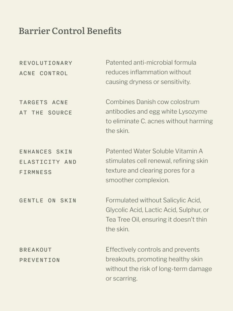 Clinically tested and dermatologist-approved, Barrier Control is the ultimate acne solution designed to clear pores, calm inflammation, and strengthen the skin barrier. Powered by antibodies from Danish cow colostrum and lysozyme, it targets C. acnes bacteria without damaging healthy skin.